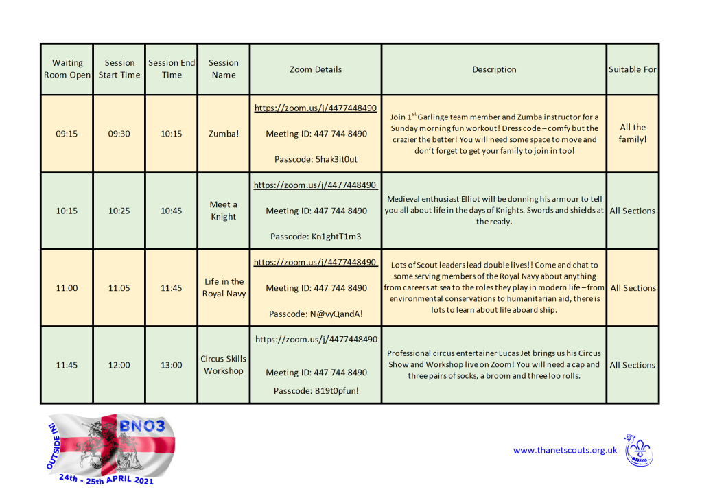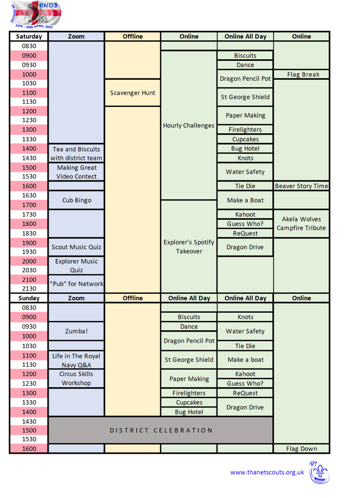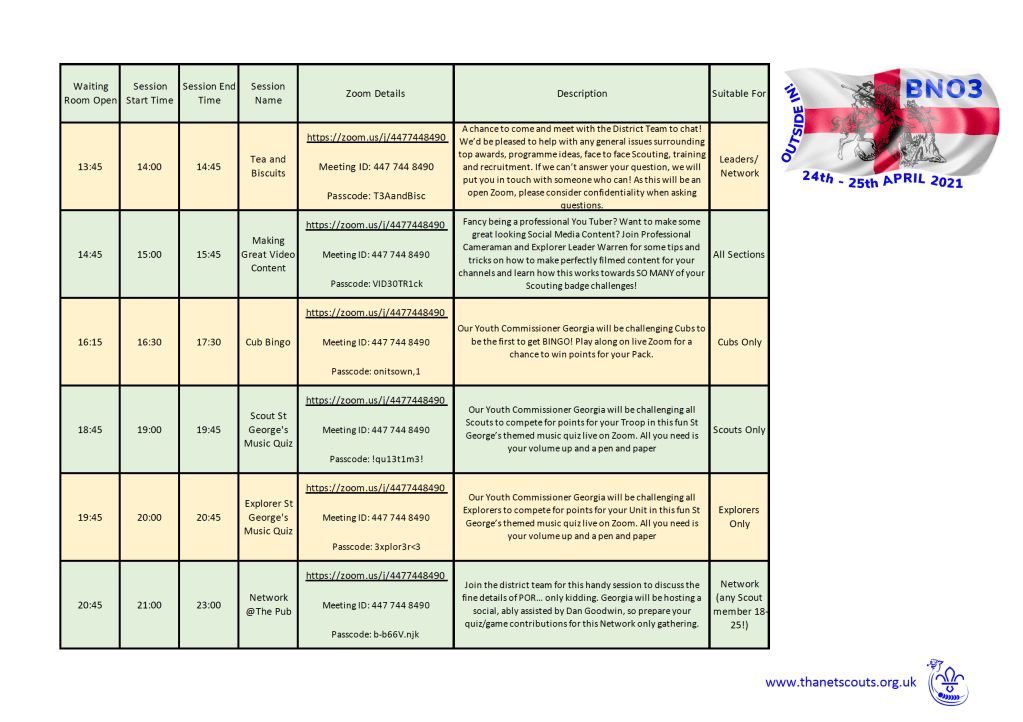 As a Scout Group, we are taking part in the Thanet Scouts Big Night Out 3 from 24th – 25th April 2021 as part of our St George’s Day celebrations. This is a virtual camp that you will be able to take part in at home and it is open to all Beavers, Cubs and Scouts. Here is a list of things to get you prepared for the weekend along with the timetable and details for the Zoom based sessions. Nothing on the list is essential and there may be things still to come that aren’t on the list. When joining any of the Zoom sessions, please can young people make sure that they identify themselves with their first name and Group for their Zoom logon. Other information about the non-Zoom based activities will be posted on the Thanet Scouts social media. They are @ThanetScouts on Facebook and Instagram, and Thanet District Scouts on YouTube.