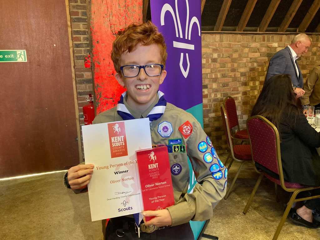 A huge congratulations to Oliver Norton (one of our Explorers and also a Young Leader) for being awarded with the Kent Scouts Young Person of the Year Award for 2022. 1st St Lawrence also got runner-up for the Community Impact Award.